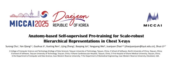 赵涓涓院长团队论文“Anatomy-based Self-supervised Pre-training for Scale-robust Hierarchical Representations in Chest X-rays”入选主会高光论文。这是我校近年来首次在该会议发表论文,代表了我校在人工智能领域研究的又一重大突破。该论文通讯作者为赵涓涓教授,第一作者为2022级博士生褚苏荣。论文聚焦于运用人工智能算法,深入探究医学图像中解剖结构之间的内在关系,并借助这种关系优化计算机自动疾病诊断与病灶分割的性能。